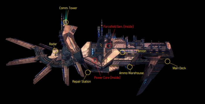 - Destroying defensive turrets damage the Carrier Ship's Hull by 250 pts each time.