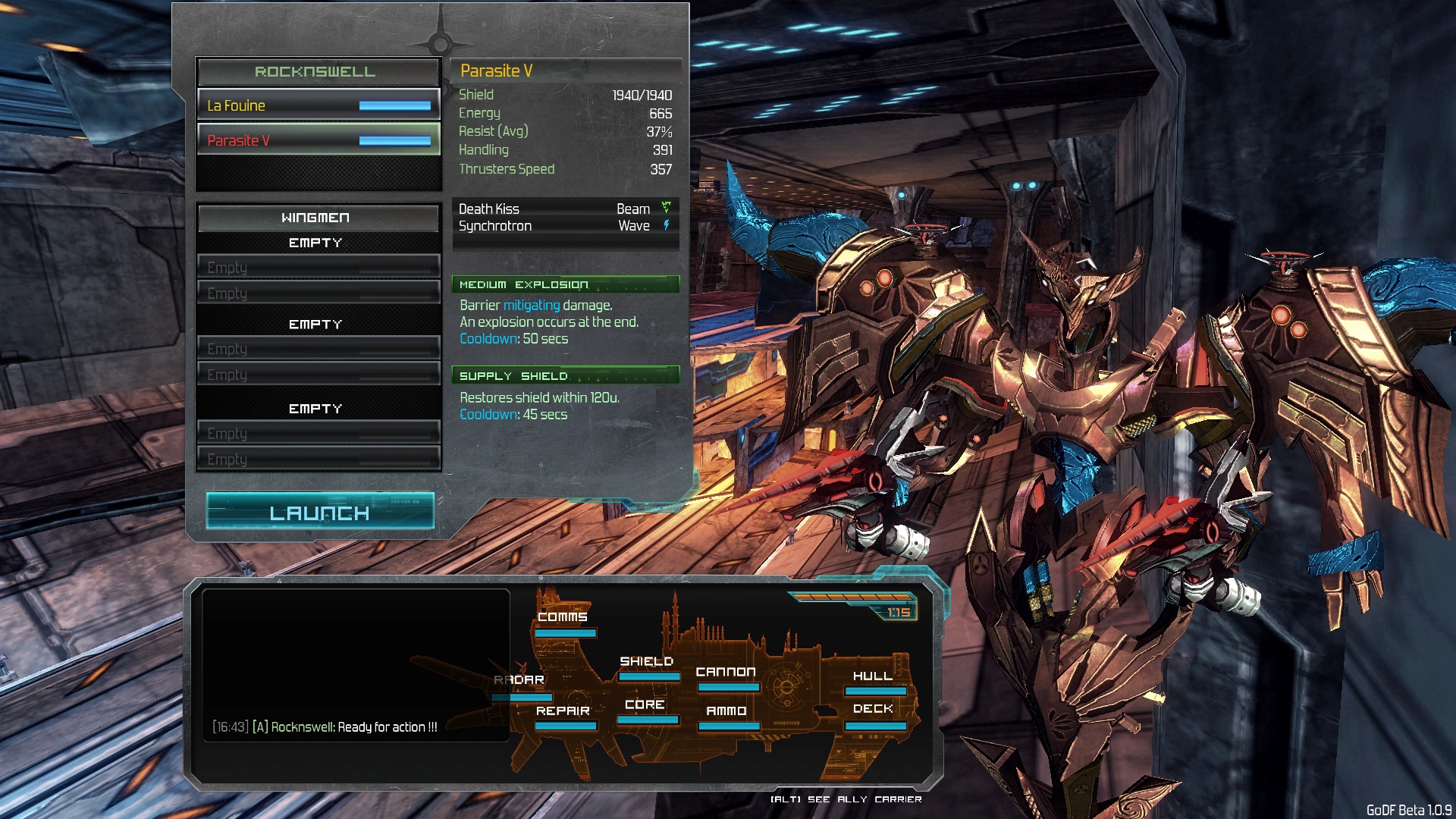 The Docking Bay is also used to gather information on the state of the match. From this position, you can look at both carrier ships' parts by pressing Alt and inform your teamates via the Chat or Voice Commands of which parts are damaged.